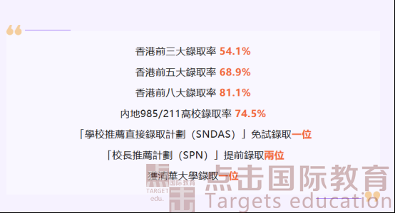 升学情况:申请中国香港方向的学生中,超过50%的学生被港三大录取:申请内地方向的学生中,近10%的学生被C9高校的录取,同时超30%的同学被985高校录取;申请英国、澳洲以及美国地区大学的学生,100%收获QS世界前30大学录取,100%收获USNEWS美国前50大学。